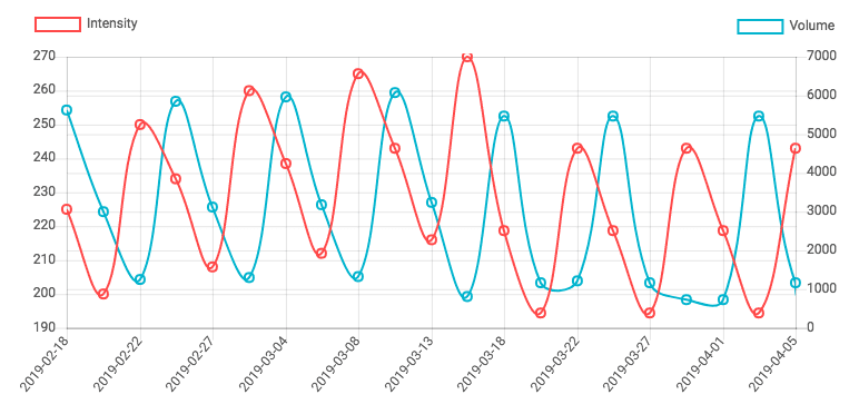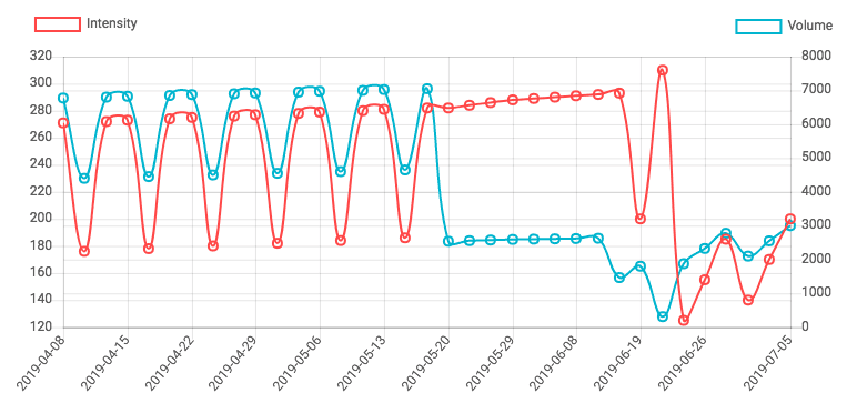 You'll notice that the lifter starts out on a steady upward trajectory in terms of both intensity and volume. However, at one point, the total volume lifted starts to dip as the weight on the bar increases. After a couple dips in total volume, the routine is changed to introduce an active recovery day to allow for more recovery time. From there, the routine continues to increase the weight on the bar, but not in a straight line.